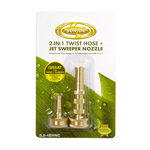 -. Brand : Snow Joe -. Feature : Includes spray nozzle and jet sweeper nozzle / Heavy-duty solid brass construction / One nozzle sprays a gentle shower or high-pressure stream / The second nozzle blasts a concentrated jet / Fits any standard garden hose -. Label : Snow Joe LLC -. Manufacturer : Snow Joe LLC -. MPN : SJI-4BHNC -. PackageQuantity : 1 -. PartNumber : SJI-4BHNC -. ProductGroup : Lawn & Patio -. ProductTypeName : OUTDOOR_LIVING -. Publisher : Snow Joe LLC -. Studio : Snow Joe LLC -. Title : Sun Joe 2-in-1 Sweeper Nozzle