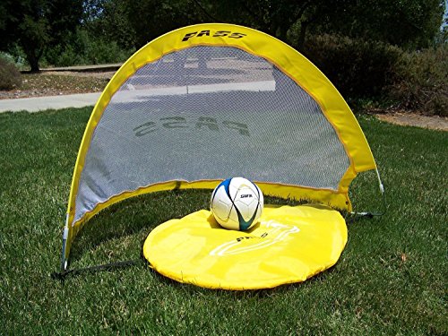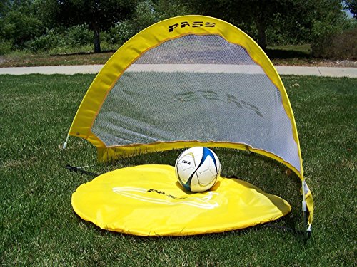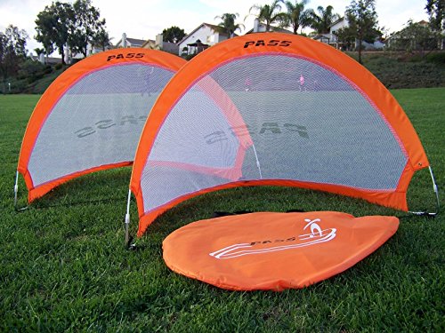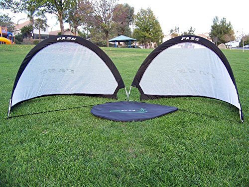 Help your child or adolescent hone his or her soccer skills with these PASS portable 4 Footer training goal set, which includes two goals and a bag. Also available in 5 and 2.5-foot sizes, the PASS 4 Footer is ideal for clinics, backyard contests, and even organized games at the park. Each 4 Footer goal is remarkably easy to set up: just hold on to the corners, and then twist the left corner counterclockwise while bringing the hands together. The 4 Footer goal sets up with a quick twist of the hands. In mere seconds, you'll have a fully functional soccer goal, with anchoring pegs to help adhere it to the ground. The goal collapses just as quickly into a flat oval that measures 1-inch thick, with a handy carrying bag for easy transport. As a result, you can vacate the practice field as soon as the weather turns, and without having to break down a cumbersome multi-piece goal system. Each 4 Footer measures 4 by 2 by 2 feet (W x H x D) when installed and is safe for both kids and adults. The set comes with two goals, one carrying bag, and anchoring pegs. The PASS portable soccer training goals offer an innovative, lightweight and collapsible design that you can easily carry to the field. These goals set-up quickly and can be secured down with the included achoring pegs so you're quickly ready for games or drills. They fold down to a 1-in flat oval and come with a handy carry bag.Feature