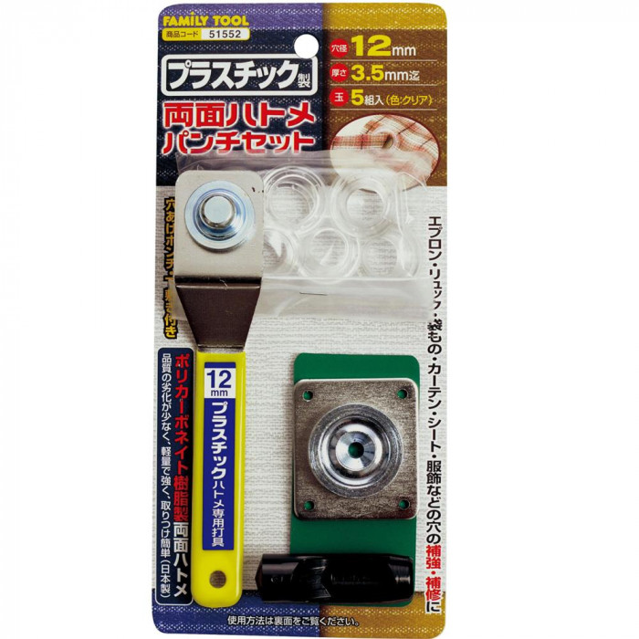 fk094igrjsポリカーボネイト樹脂製、品質の劣化が少なく、軽量で強く取りつけ簡単 サイズ 個装サイズ:4×21×10cm 重量 個装重量:223g 素材・材質 ポリカーボネイト 仕様 ■12mm(厚さ3.5mm迄)ハトメ玉:5組入 ■クリア ■下穴ポンチ12mm ■下敷き 生産国 日本 取りつけ簡単なハトメパンチセット ポリカーボネイト樹脂製、品質の劣化が少なく、軽量で強く取りつけ簡単