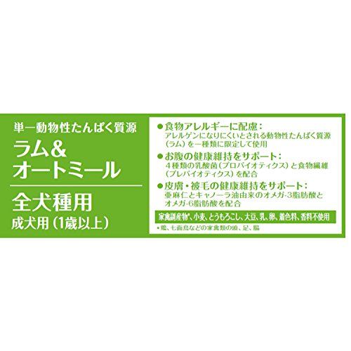 原材料:ラム、ラムミール、オートミール、えんどう、玄米、きび、粗挽き亜麻仁、キャノーラ油(ミックストコフェロールで酸化防止)、トマトポマス、ラムエキス、チコリ根抽出物、ラクトバチルス・プランタルム※、エンテロコッカス・フェシウム※、ラクトバチルス・カゼイ※、ラクトバチルス・アシドフィラス※、ビタミン類(E、コリン、ナイアシン、ベータカロテン、A、B1、パントテン酸、 B6、B2、D3、ビオチン、B12、葉酸、C)、ミネラル類(亜鉛タンパク化合物、硫酸亜鉛、炭酸カルシウム、 硫酸第一鉄、鉄タンパク化合物、硫酸銅、銅タンパク化合物、 マンガンタンパク化合物、硫酸マンガン、亜セレン酸ナトリウム、ヨウ素酸カルシウム)、アミノ酸類(タウリン)、酸化防止剤(ミックストコフェロール、ローズマリー抽出物、緑茶抽出物、 スペアミント抽出物) ※乳酸菌