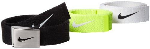 -. Feature : Golf Three-in-One Web Belt Pack includes a trio of colored bands and a metallic buckle with a cut-out Swoosh design / Three solid textile belts / Adjustable and cut to size / One size fits up to 42 / 1.5" wide