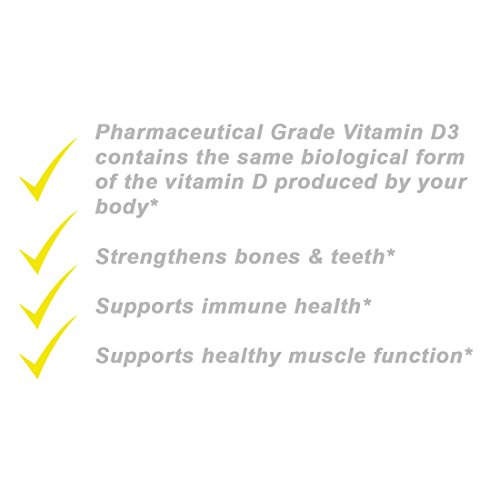 VITAMIN D3 BENEFITS - Our Vitamin D3 5000IU is pharmaceutical grade Vitamin D, the same quality doctor prescribed and recommended. The Vitamin D Council recommends 5000 UNITS of Vitamin D3 daily for adults to achieve and maintain optimal levels. Vitamin D supports over 3000 cells in your body, bone health, healthy muscle function, immune support and dental & teeth health.