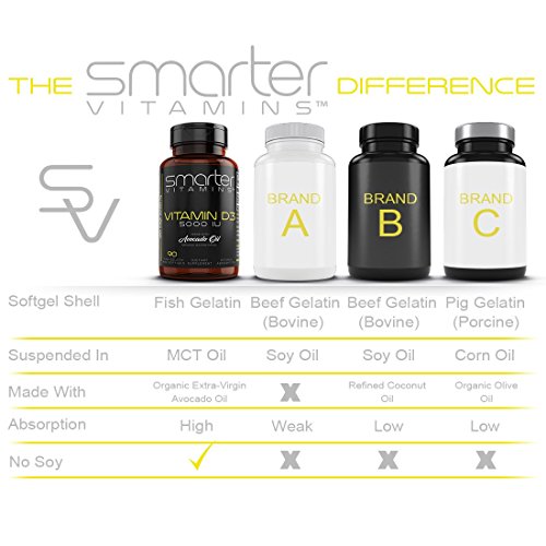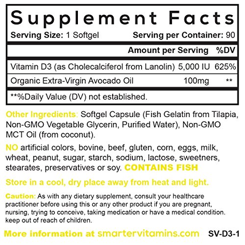 Smarter Vitamins Vitamin D3 5000iu Made W/ Extra-Virgin Organic Cold-Pressed Avocado Oil + Fish Softgels