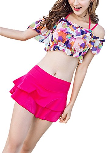 -. Title : (サラキッド) SaraKid 花柄 ビキニ フリル 水着 3点 セット オフショルダー フレア イエロー グリーン レッド (レッド XLサイズ)