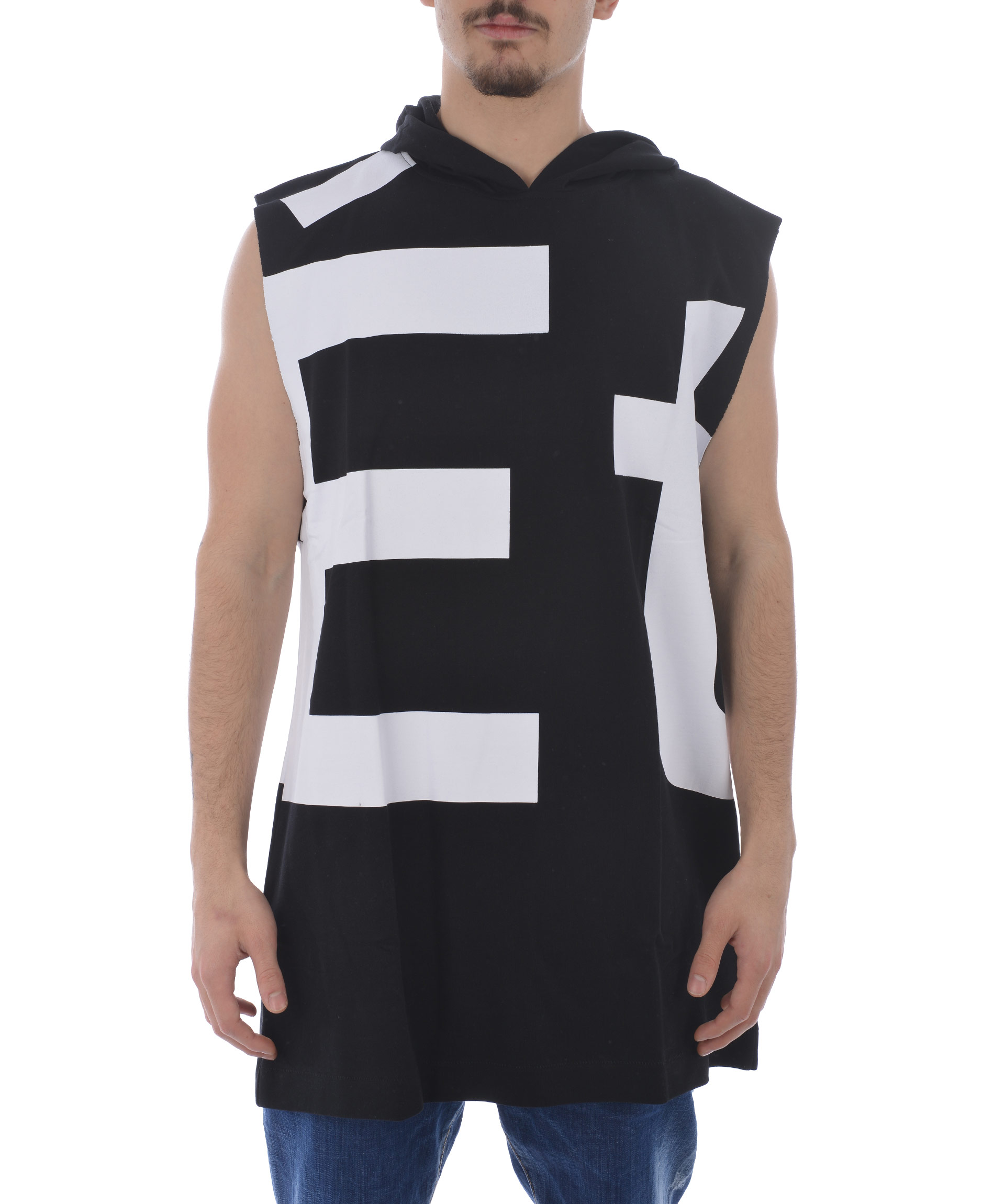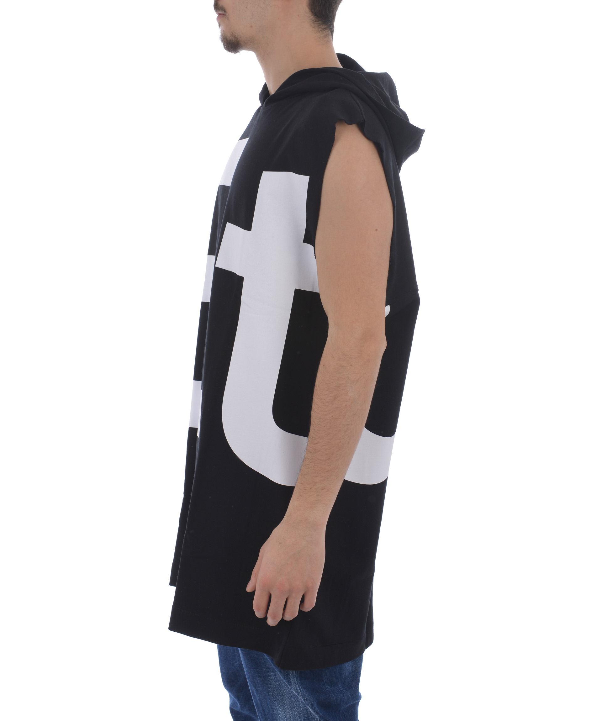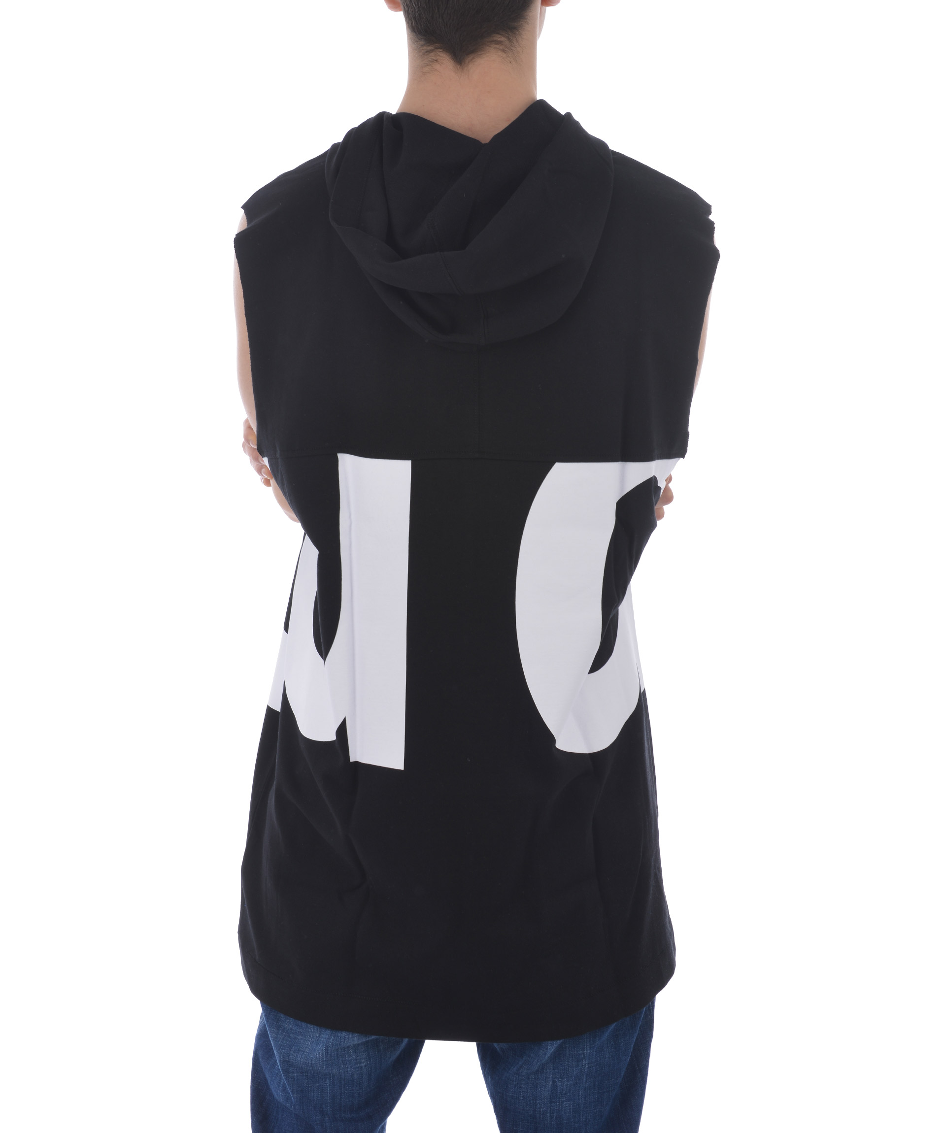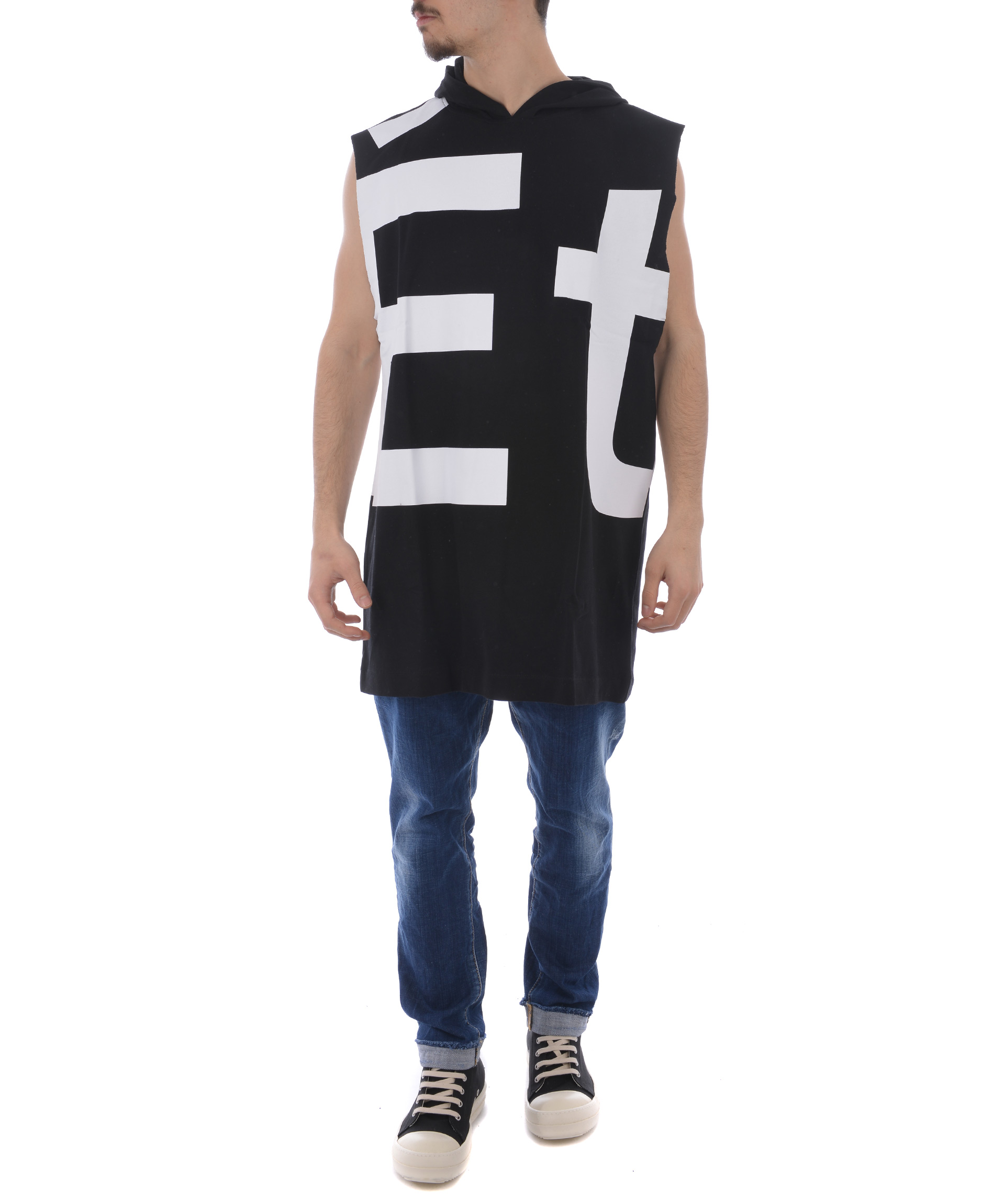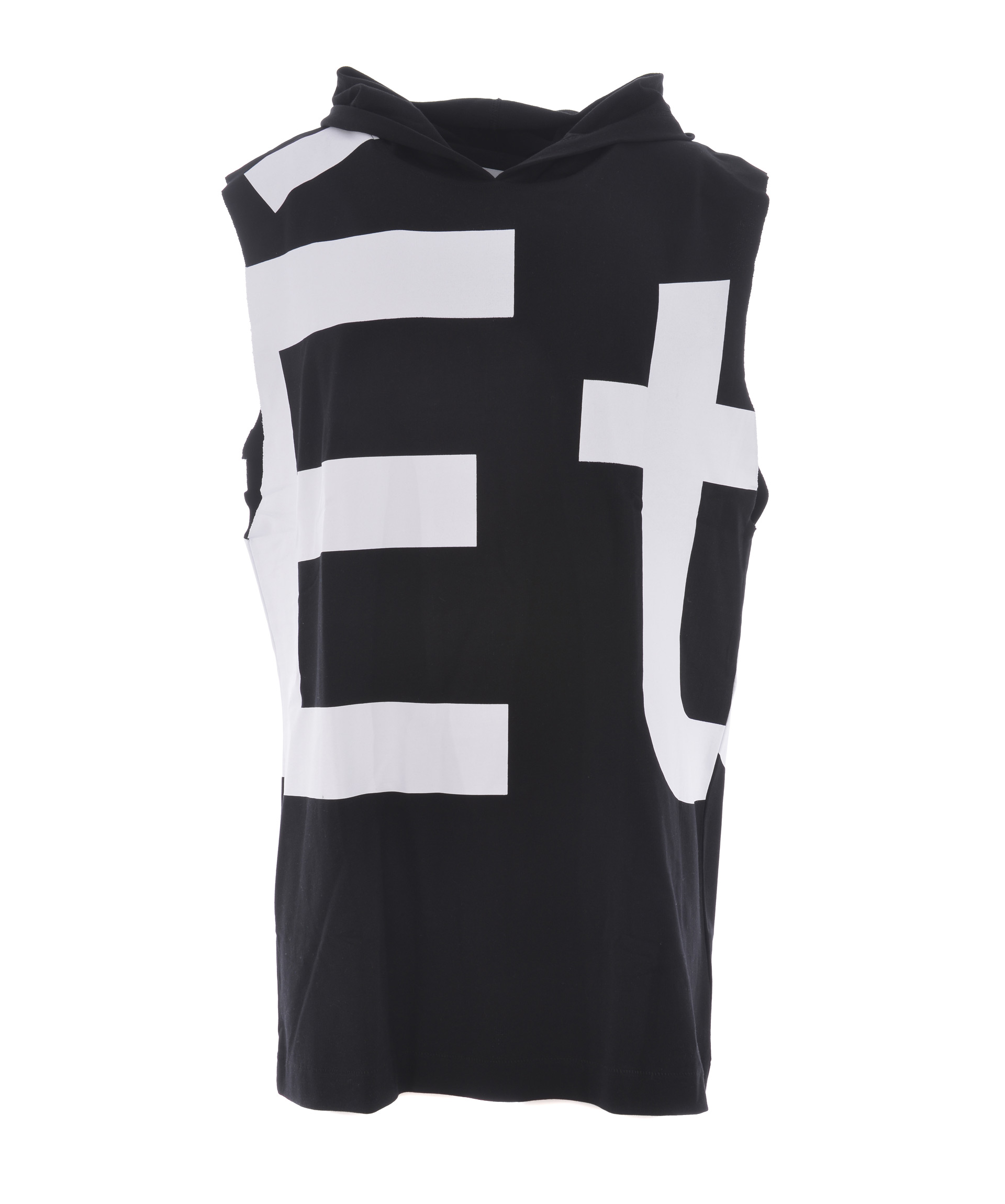 Sleeveless Hoodie from Etudes: Black Sleeveless Hoodie with straight hem, hood, printed and sleeveless design.