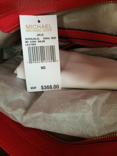 -. Binding : Shoes -. Brand : Michael Kors -. Color : Coral Reef -. Department : womens -. EAN : 0190049137802 -. Feature : Vibrant pebbled leather with polished golden tone hardware / Custom monogram fabric interior with zippered pocket, four slip pockets and key fob / Zippered top closure with two side zippered pockets with fringe tassel pulls / Single shoulder strap with 7" drop, or use removable and adjustable strap / Measures approximately 13 inches (L), x 11 inches (H) x 3 inches (W) with an MSRP of $368.00 -. IsAdultProduct : 0 -. Model : 30S6GJQL2L801 -. MPN : 30S6GJQL2L801 -. PackageQuantity : 1 -. PartNumber : 30S6GJQL2L801 -. ProductGroup : Apparel -. ProductTypeName : LUGGAGE -. Size : Medium -. Title : Michael Kors Julia Medium Leather Shoulder Bag in Coral Reef -. UPC : 190049137802