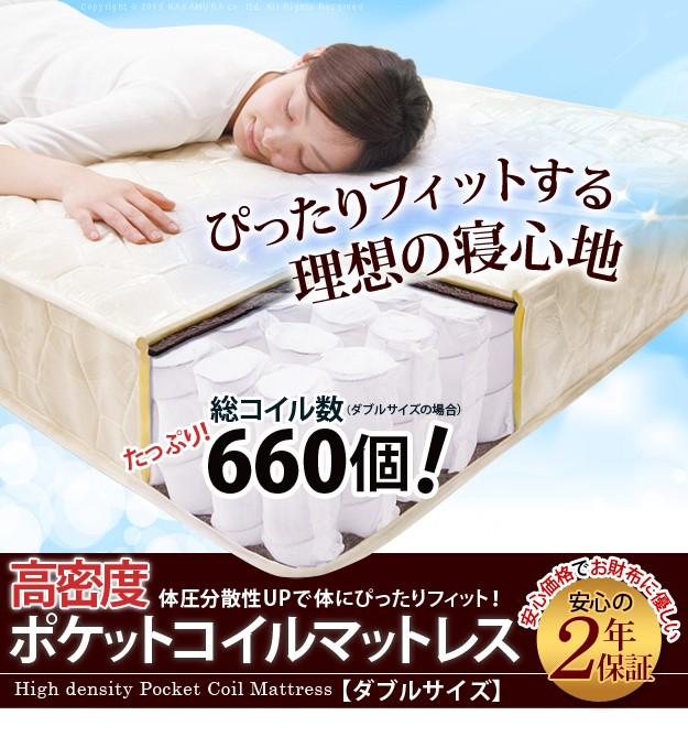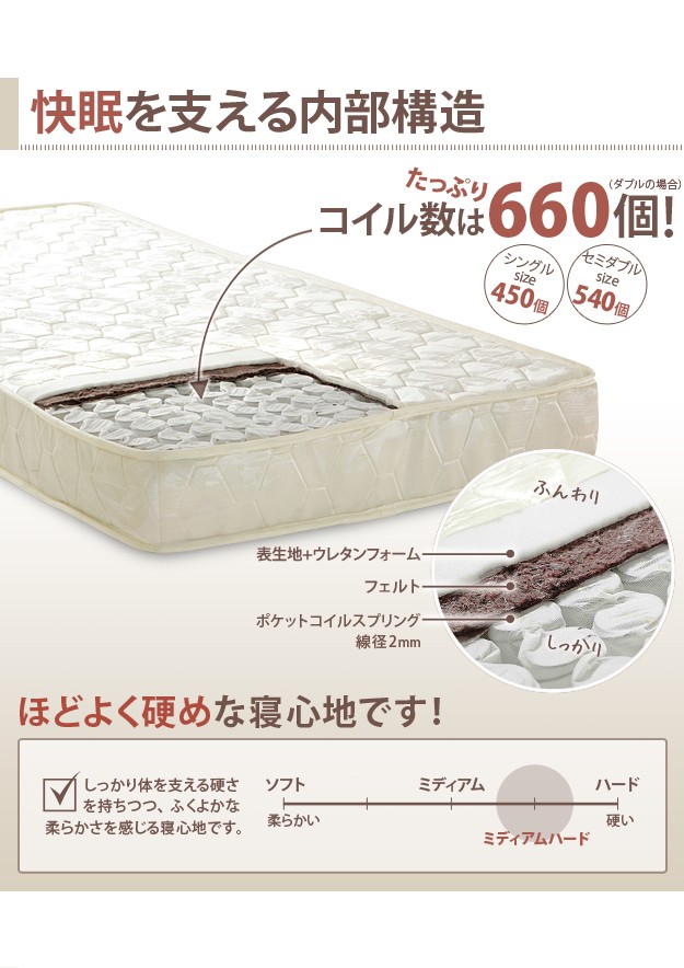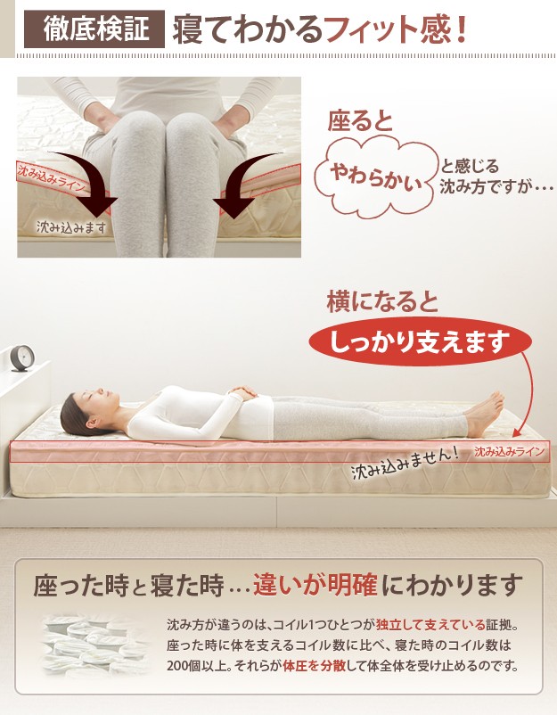 ●商品について:【ポケットコイルスプリングマットレス】独立した袋状のポケットにスプリングが1つ1つ入っている、体圧が分散され横揺れが少ないマットレスです。理想的な寝姿勢を保ち、ソフトな寝心地を好む方にお勧めです。