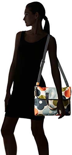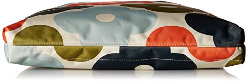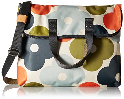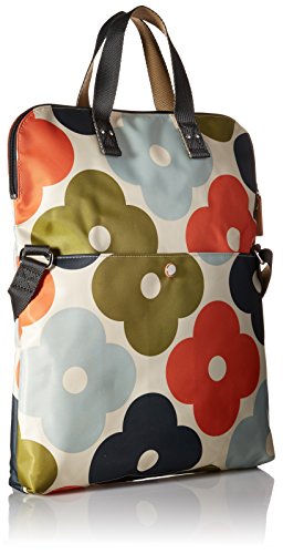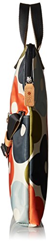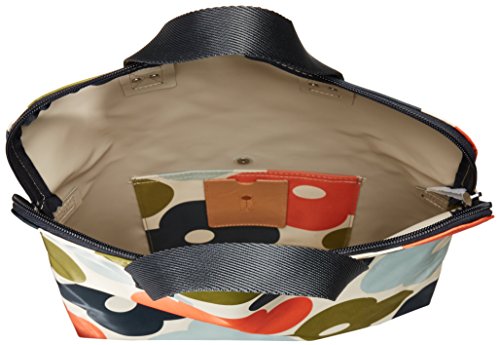 Giant flower spot' printed tote bag with zip closure. Tote bag folds over to be worn as a cross-body style with long adjustable webbing strap. Double sided webbing handles and large pocket on back of bag. Unlined, with contrast colored seams. Silver colored hardware. Inside details include large patch pocket with small leather logo card holder and contrast colored binding.