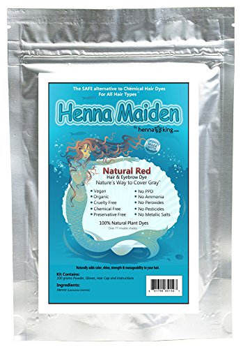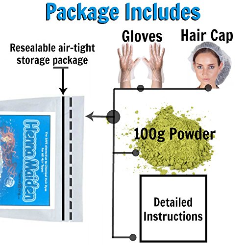 Henna Maiden Hair Dye is "Nature's Way to Cover Grey". Henna & Herbs that's it! Our Henna Maiden Hair Dye is a gift from nature with 10 mixable shades to create an infinite range of colors . Want rich, luscious, shiny hair that dazzles everyone? Henna coats the hair shaft so it always looks natural and translucent, especially in the sun! Your hair will be stronger, healthier and more manageable with tons of shine and bounce! Henna will smooth split ends, protect from the elements and cleanse the scalp promoting hair growth. All of our Henna Maiden Hair Dyes are FDA approved for use on your hair, do not contain any metal salts, peroxide, PPD's or harsh chemicals. That means no more burning and no more health risks associated with chemical hair dyes. Once you try it you'll never go back! Henna Maiden is Vegan of course! Our easy 1 Step method means no complicated mixing of multiple powders and herbs, we have created the perfect blend; you simply add water, mix and apply the dye! HENNA MAIDEN Hair Dye kit includes 100 Grams of finely sifted organic Henna & herbs, gloves, hair cap and application instructions. We ship same day on orders placed Monday - Friday before 3pm Eastern (12pm Pacific) from our office and warehouse located in Las Vegas, Nevada, USA. We are a proud family owned business for the past 15 years. Any questions just give us a call or send us a message. Thank you! NOTE: Short Hair = 1/3 - 1/2 Package (30 - 50 grams), Neck Length = 1 Package (100 grams), Shoulder Length = 1.5 to 2 Packages (150 - 200 grams), Mid Back Length = 2 to 3 Packages (200 - 300 grams), Waist Length = 3 to 4 Packages (300 - 400 grams) • Do not use in the area of the eye • Do not use on cut or abraded scalpFeature