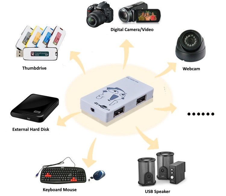 KingShare 4-Port USB 2.0 Hub provides 4 Hi-Speed USB 2.0 ports for your USB connectivity needs. This device is USB 2.0 compliant and provides a high-speed data transfer rate. Compact and lightweight, the Hub is stylish and functional. The side panel port design offers more convenience and flexibility. The Hub also supports USB 1.1 devices since it is backward compatible with USB 1.1 specifications. It is very easy to use, Plug-n-Play, and hot swappable.