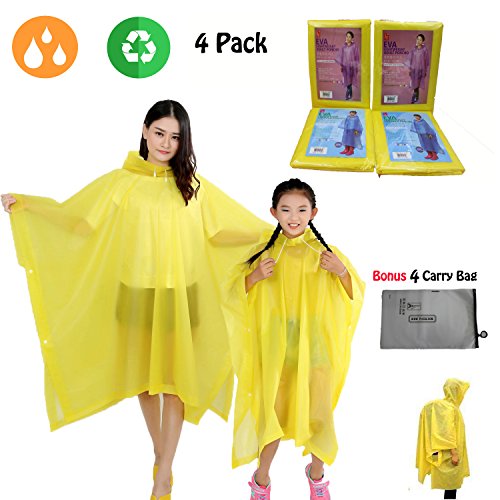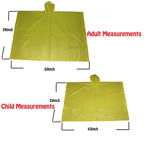 - 4 FAMILY PACK RAIN PONCHOS:2Adult(39*50 inch,5.6oz)and 2Child (35*43inch,4.6oz)Size. Individually packed , yellow color rain poncho with 4 carry bag.