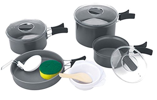 [PRODUCT DETAILS] Each set includes 1 frying pan, 3 pots, 3 pot lids,6 trays, 1 kettle, 1 soup ladle, 1 wooden spatula/turner, 1 cleaning sponge and a storage bag