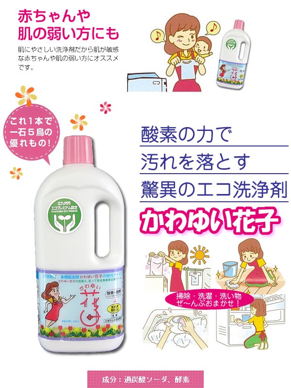 洗い・漂白・脱脂・除菌・消臭、これ1本で5つのパワー!酸素の力で汚れを落とすとってもエコな洗浄剤。洗濯・掃除・食器洗い・・・ぜ~んぶ花子におまかせ!赤ちゃんの食器や衣類にもお使いいただけます。