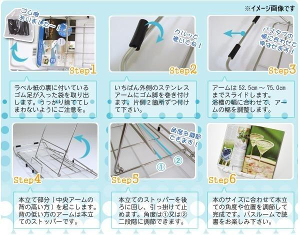 ブックスタンドが取り外せて使用できます。ブックスタンドを外せば、防水のTVやラジオや携帯電話なども置けます。浴槽幅に合わせて52.5~75cmまでスライド可能!! |
