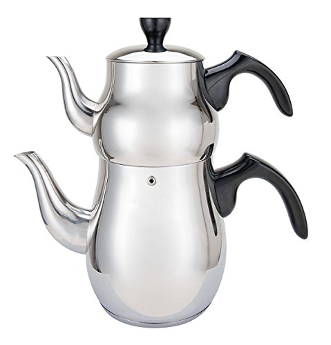 Get this elegant double tea kettle. Made out of 18/10 high quality stainless Steel. That can be used on any type of stove. Easy to clean. Comes with plastic handles for easy handling.Feature