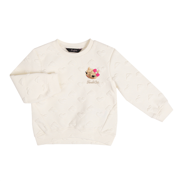 산듯한 화이트 컬러의 박시한 라인의 맨투맨 티셔츠 입니다. 하트 모티브 쟈가드 다이마루 원단으로 만들어져 착용감도 편안하며 포근한 느낌을 줍니다. 골드 고양이 포인트로 귀여운 느낌을 더해주었습니다. 착용감 쌀쌀한 날씨에 입기 좋으며, 데님 아이템이나 레깅스, 스커트 모두 어울리는 활용성이 높은 데일리 아이템입니다.