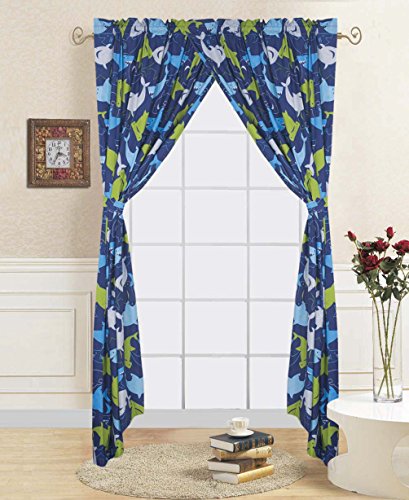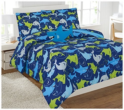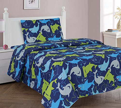 Golden Linens Reversible 6 Pieces Twin Size Printed Lime Green, Blue, Navy Blue and grey Shark Microfiber Kids Bed In Bag Bedding Comforter with sheets and pillow cases