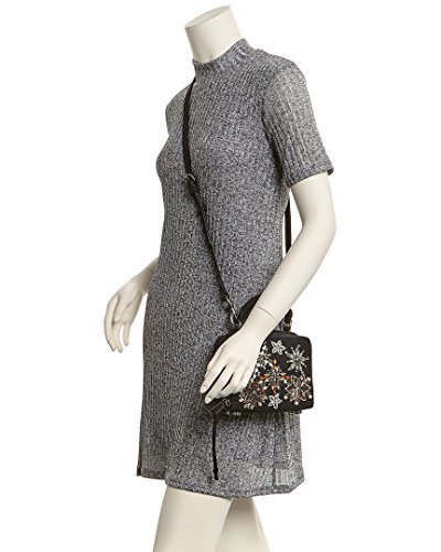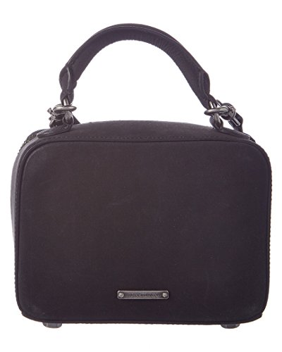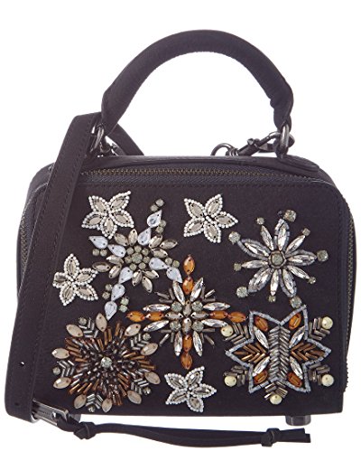 A nubuck Rebecca Minkoff cross-body bag with a boxy silhouette and crystal-studded accents. Wraparound zip and lined, 1-pocket interior. Rolled handle and optional, adjustable shoulder strap.