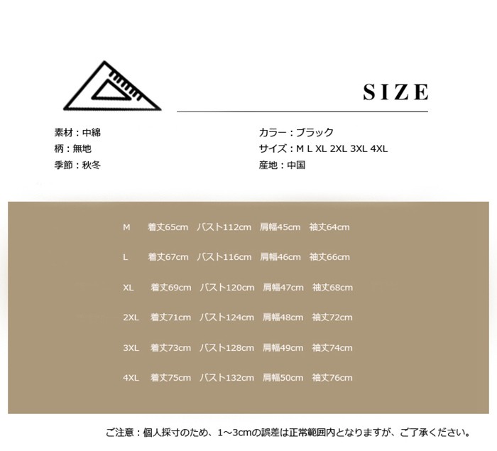 ジャケット メンズ 中綿ジャケット ダウンコート ショート丈 ダウンジャケット メンズ 無地 大きいサイズ カジュアル アウター 2018秋冬新作 中綿ジャケット メンズ ジャケット ダウンコート ショート丈商品詳細素材:中綿柄:無地季節:秋冬カラー:ブラックサイズ:M L XL 2XL 3XL 4XL産地:中国サイズ参照表M 着丈65cm バスト112cm 肩幅45cm 袖丈64cm L 着丈67cm バスト116cm 肩幅46cm 袖丈66cm XL 着丈69cm バスト120cm 肩幅47cm 袖丈68cm 2XL 着丈71cm バスト124cm 肩幅48cm 袖丈72cm 3XL 着丈73cm バスト128cm 肩幅49cm 袖丈74cm 4XL 着丈75cm バスト132cm 肩幅50cm 袖丈76cm ご注意:個人採寸のため、1~3cmの誤差は正常範囲内となりますが、ご了承ください。ジャケット メンズ 中綿ジャケット ダウンコート ショート丈 ダウンジャケット メンズ 無地 大きいサイズ カジュアル アウター 2018秋冬新作 中綿ジャケット メンズ ジャケット ダウンコート ショート丈