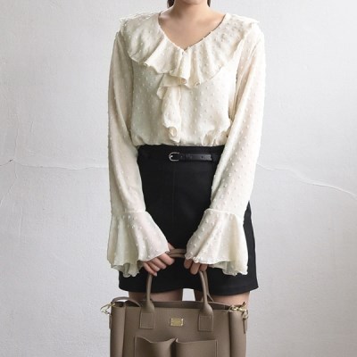 벨커프스 프릴 쉬폰블라우스 로맨틱한 무드의 프릴 쉬폰 블라우스를 소개해드릴게요 도트 모양의 짜임이 들어가있는 입체 적인 원단으로 제작되어진 블라우스로 세련된 무드가 느껴지는 제품이에요 적당히 파인 네크라인이 목선을 길어 보이게 해주는 효과를 주고 있는 블라우스로 추천드리고 있어요 네크라인과 소매라인의 과하지 않은 프릴 디테일이 러블리함을 더해준 상품이에요 색상은 블랙, 베이지 기본적인 두컬러로 준비해드렸으니 원하시는 무드에 맞춰 굿 초이스 해보세요 / beige