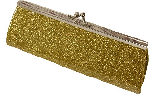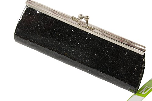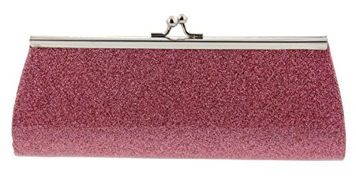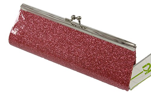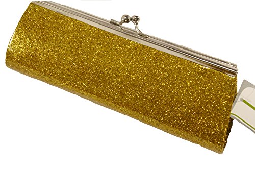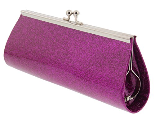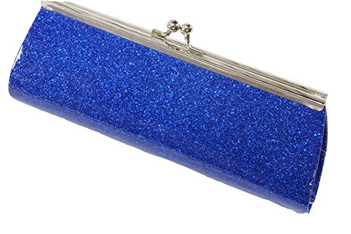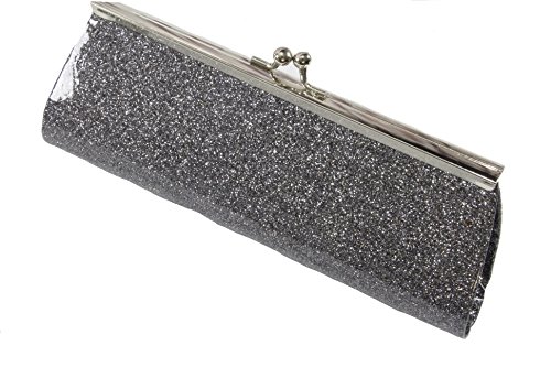 KJ women's sparkly evening clutch purse in a bullet shape with a metal link strap to use as a should bag if needed. This sparkly glitter clutch will hold all of your essentials for your big night out. It has a kiss clasp and measures 8" long by 1.5" wide. The clutch is also a great option for weddings, proms, special dances or travel or cruising. The glitter is encased in the material, so it will not shed.Feature