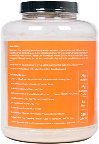 -. Feature : ONLY TWO INGREDIENTS: Naked Whey and Sweet Potato Powder. Naked One To One contains no artificial sweeteners, flavors, or colors and is GMO Free, Growth Hormone Free, Soy Free and Gluten Free. / BALANCED NUTRITION: 25g of Protein, 25g of Carbs, 210 Calories, 5.8g of BCAAs (branched-chain amino acids) per serving. / CLEAN PROTEIN: All natural whey provides your body with healthy amino acids to keep protein synthesis up throughout the day. / PREMIUM COMPLEX CARBOHYDRATES: Dehydrated sweet potato powder from US farms provides a clean source of complex carbohydrates. / PROTEIN SHAKES AND RECIPES: Our natural unflavored protein blend is versatile in making protein shakes, smoothies and recipes. Boost protein, carbohydrates, and nutrition by adding Naked One To One to protein bars, cookies and other recipes.