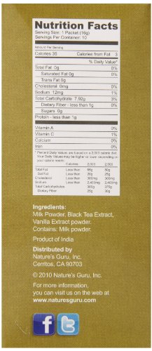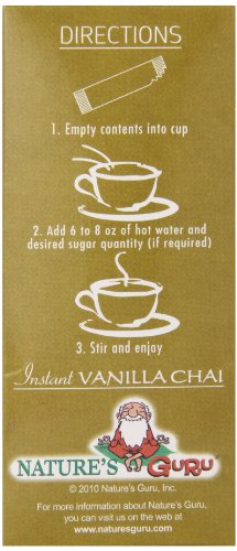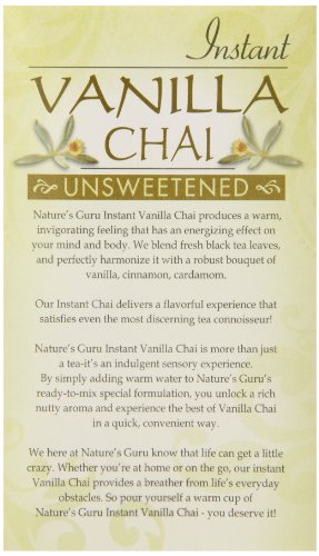 -. Feature : Ingredients: black tea extract, milk powder and vanilla tea extract; Contains milk / Directions: add Nature's Guru chai mix to 6-8 ounce (240 ml) of hot water. Stir and enjoy a delicious cup of gourmet chai / Unlock the treasures of southeast Asia with Nature's Guru instant vanilla chai - unsweetened; Enjoy the convenience of experiencing our rich and creamy specially formulated premium chai tea blend anywhere - at home, office, or while traveling on the go / Instant gratification / Directions: add Nature's Guru chai mix to 6-8 ounce (240 ml) of hot water; Stir and enjoy a delicious cup of gourmet chai