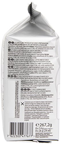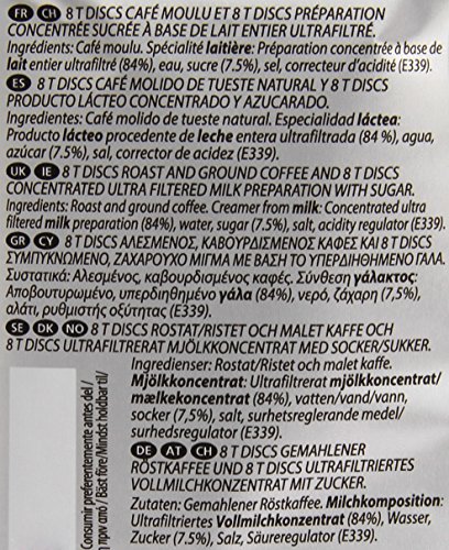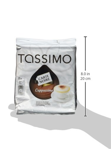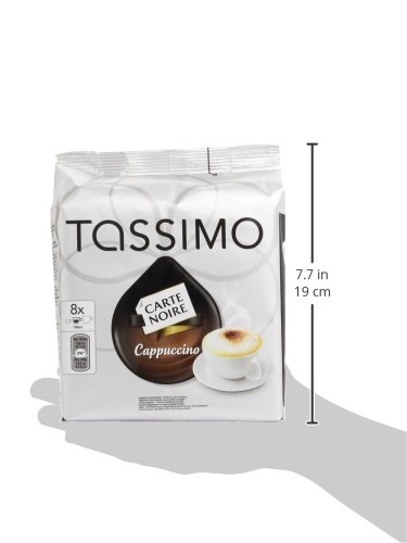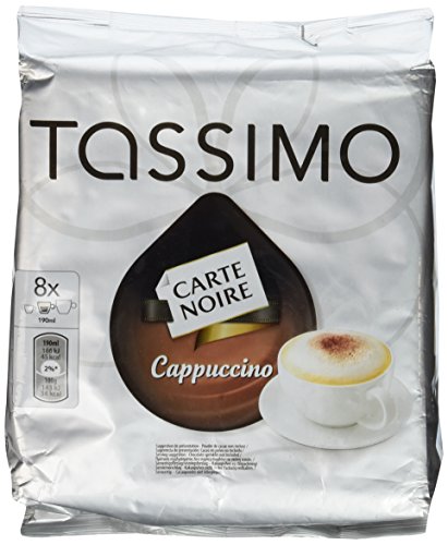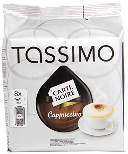 Studio : Kraft Foods Publisher : Kraft Foods Binding : Grocery Product Description Carte Noire Cappuccino T-Discs bring you a cappuccino par excellence - great overall body with a perfect milky froth.Lieferumfang:1 pack Tassimo Carte Noire Cappuccino with 16 T-Discs for 8 servings Pack contains: 8 T-Discs with 7.4g Espresso 8 T-Discs with 26g latte creamer from milk Net weight: 267.2g / pack 0