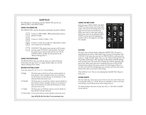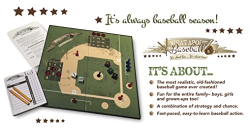 -. Feature : The Most Realistic, Old-Fashioned Baseball Board Game Ever Created! / Fun for the Entire Family - Boys, Girls and Grown-Ups, too. / A Combination of Strategy and Chance. A board game that kids ages 8 and up will love! They will be asking for more time on this instead of their electronic devices. / Fast-Paced, Easy-to-Learn Baseball Action in a fun board game format. / Game Includes Playing Pieces, Baseball Diamond Playing Board, Score Sheets and Special Batting and Pitching Dice for Realistic Action.