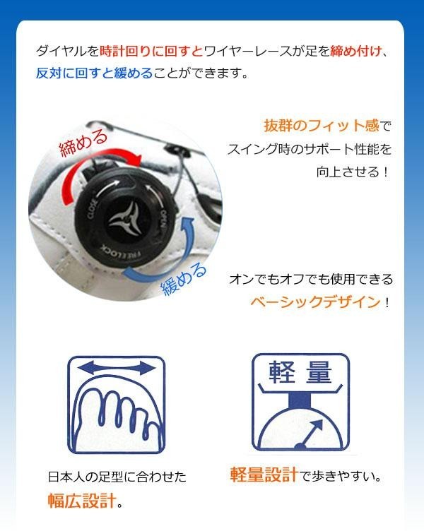 | 日本人の足型に合わせた幅広設計のシューズです。ダイヤルを時計回りに回すとワイヤーレースが足を締め付け、反対に回すと緩めることができます。軽量設計で歩きやすく、抜群のフィット感でスイング時のサポート性能を向上させます。オンでもオフでも使用できるベーシックデザインです。 |
