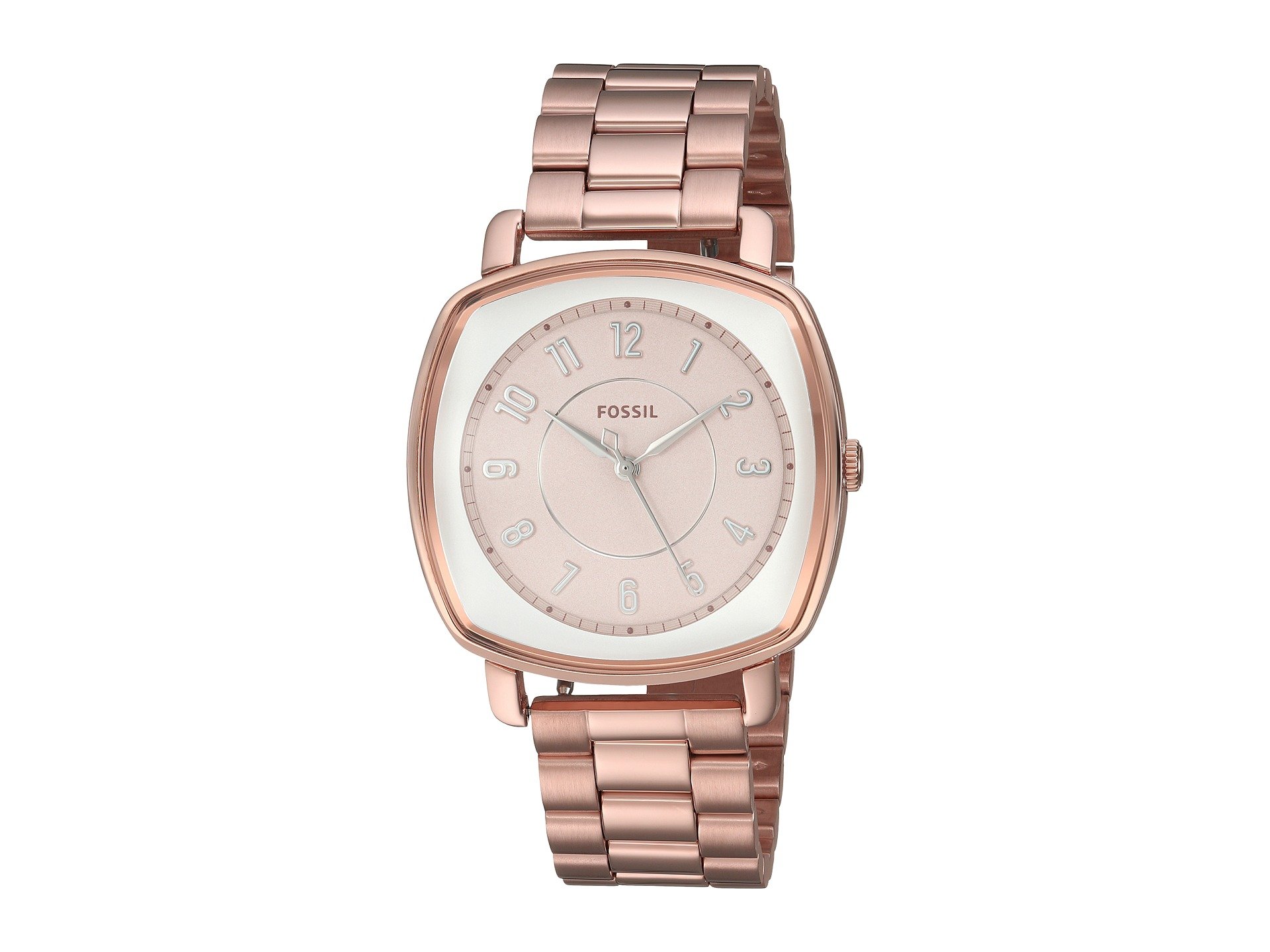 | Product Information SKU: #8988829Femininely chic, this lovely watch from Fossil? will catch all the adoration!Stainless steel case.Stainless steel bracelet with fold-over, double push-button release. Square face.Three-hand analog display with quartz movement.White dial features rose gold-tone hands, hour markers, minute track,and Fossil detailing.Water resistant 5 ATM.Imported.This product may have a manufacturer's warranty. Please visit the manufacturer's website or contact us at warranty@support.zappos.com for full manufacturer warranty details.Measurements: Case Height: 36 mm Case Width: 36 mm Case Depth: 9 mm Band Width: 17 7?9 mm Band Circumference/Length: 9 in Weight: 3.8 oz |