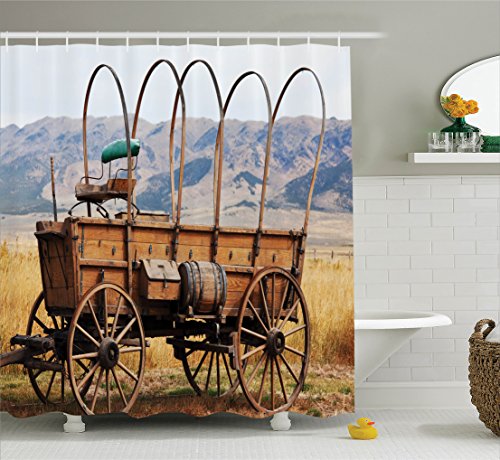 Western Decor Shower Curtain Set by Ambesonne, Photo of Old Nostalgic Aged Wild West American Cart Carriage in the Farm Texas Style, Fabric Bathroom Set with Hooks, 69W X 70L Inches, Brown and Caramel