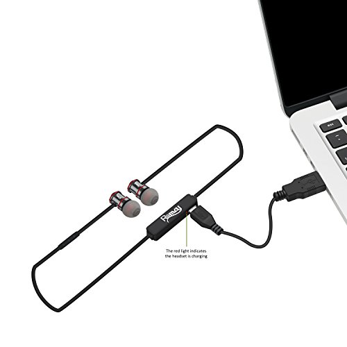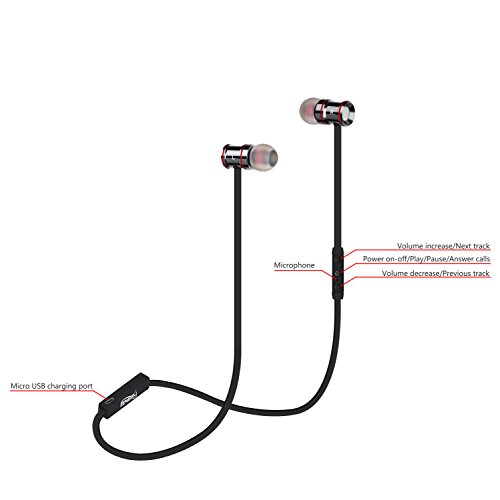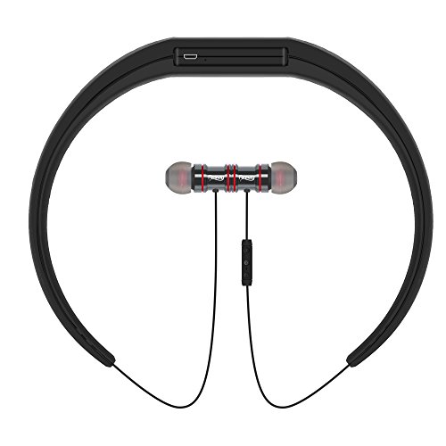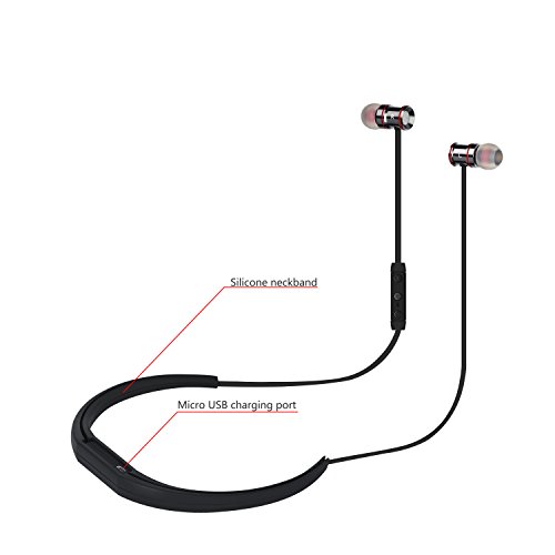 -. Feature : Detachable and unique neckband is very quick and easy to install and the ear hook attachment increase the stability of the earphones preventing them from dropping and slipping out the ears. Different sized interchangeable earcaps to fit different sized ears. / Ideal for gym workouts, playing sports, biking and other physical activity. Use as a hands-free device with the built-in microphone. Metal earphones are very sturdy and with built-in magnets prevent them from falling and being lost. / Latest Bluetooth 4.1 version with APTX and A2DP technology, which provides excellent stereo sound quality and stable performance. CVC noise cancellation enables higher quality audio sound by reducing external environment noises. / Bluetooth operation range is up to 10 metres in an open space. A long battery life allows a talk time of up to 5 hours or a standby time of up to 180 hours. / Fast Bluetooth connection with the majority of smartphones including the latest iphone, Samsung and other Android devices, as well as most music players and tablets.