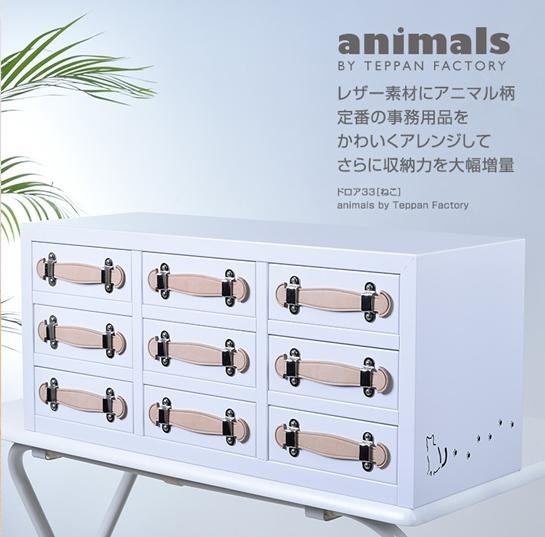 | 頑丈で実用性抜群のスチール製ファイルドロアを、ロッカーメーカーならではの発想で3列×3段に増量しました。ねこのシルエットとレザーの親しみやすい手触りが、目にするたび、手にするたび愛着を湧かせてくれます。 |