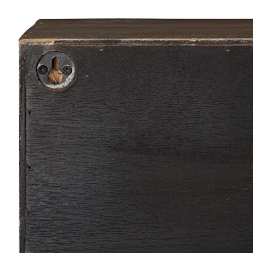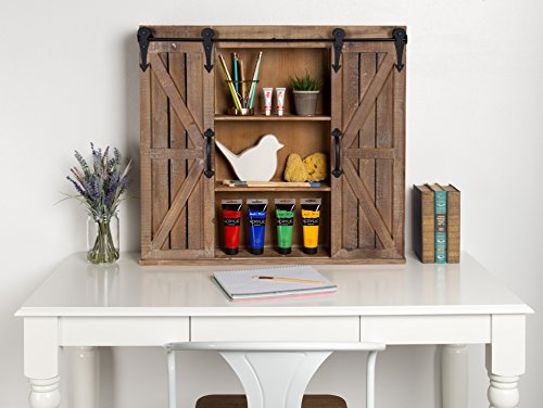Studio : Uniek Publisher : Uniek Binding : Office Product Product Description Decorate your home in vintage farmhouse style with these unique hanging wall shelves with sliding barn doors. These shelves can be used to organize your entryway, mudroom, kitchen, bathroom, living room, or guest room. This box shelf has three inner shelves and each side has two shelves to store items of different shapes and sizes. The two barn doors slide to cover either the sides or the center. The three center shelves are each 13.5 inches wide, 5.75 inches deep, and there is 8 inches of height between shelves. The side cubbies are each 7.75 inches wide, 5.75 inches deep, and have 12 inches of height between the two shelves. The outer dimensions of this wall shelving unit are 30 inches wide, 27.25 inches high, and 7.25 inches deep. Two metal keyhole hangers are inset on the back of the cabinet for easy secure wall display. This wall cabinet arrives completely assembled ready to use. 0