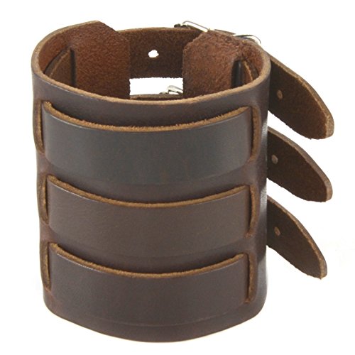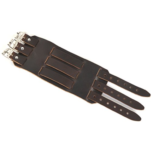 -. Binding : Misc. -. Brand : HZMAN -. Color : Brown -. EAN : 0606280601120 -. Feature : Made of real leather this bracelet combines both style with comfort. / Leather cuff wide: 7cm,2.8" / Has 6 holes for adjusting and is adjustable from approximately a maximum wrist circumference of 25 cm (9.5 inches) to approx 19 cm (7.5 inches). / Material: Leather Alloy / 90 DAY MONEY BACK GUARANTEE-100% satisfaction guaranteed. That is our promise. So, if you're not completely happy with your purchase within the first 90 days, just let us know. We will do whatever it takes to make it right -. IsAdultProduct : 0 -. IsAutographed : 0 -. IsMemorabilia : 0 -. Label : HZMAN -. Manufacturer : HZMAN -. MPN : PHW64151 -. PackageQuantity : 1 -. PartNumber : PHW64151 -. ProductGroup : Sports -. ProductTypeName : SPORTING_GOODS -. Publisher : HZMAN -. Studio : HZMAN -. Title : HZMAN Dark Brown Leather Wide Triple Strap Cuff Wrap Gauntlet Wristband Buckle Fastening Arm Armor Cuff -. UPC : 606280601120