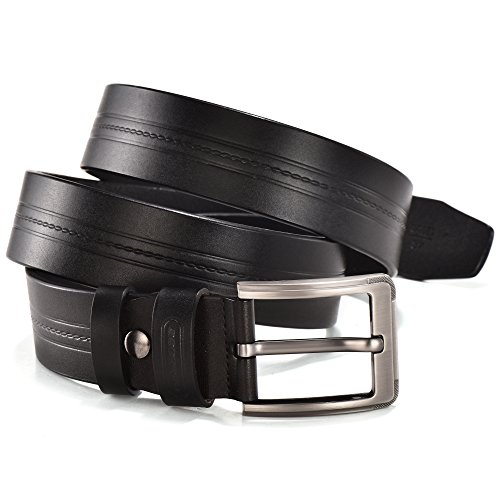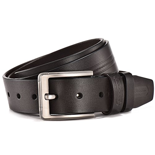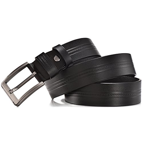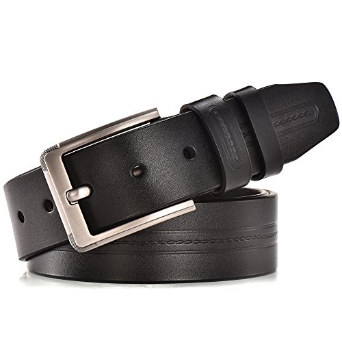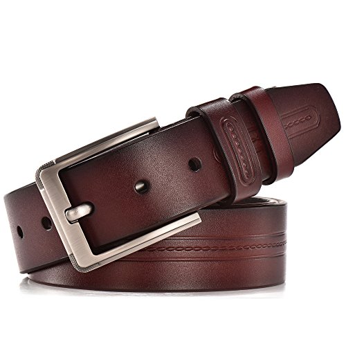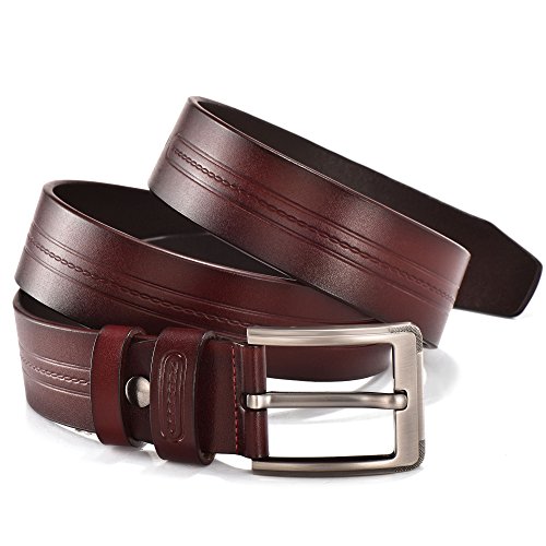 -. Feature : 100% Genuine Leather Cowhide / Trim to fit. All belts could be adjusted, just don't worry about the size. We will send you a hole puncher in every orders / 1.5"(38mm) Wide available in 3 colors and suitable for size 28-42 waist / Black, brown and red-brown belt, single prong buckle with stirrup buckle are made with zinc alloy to create a substance with greater strength and durability / New fashion design, high quality leather simple pattern with belt body, and also keep classic and vintage features. Suitable for any occasion whatever work, business and leisure or fashion and casual wear
