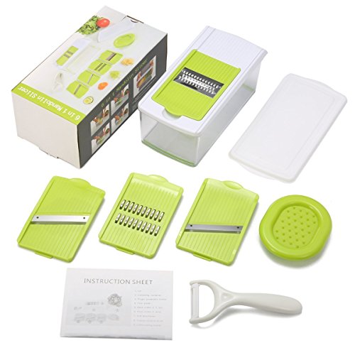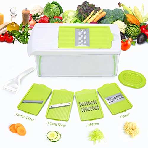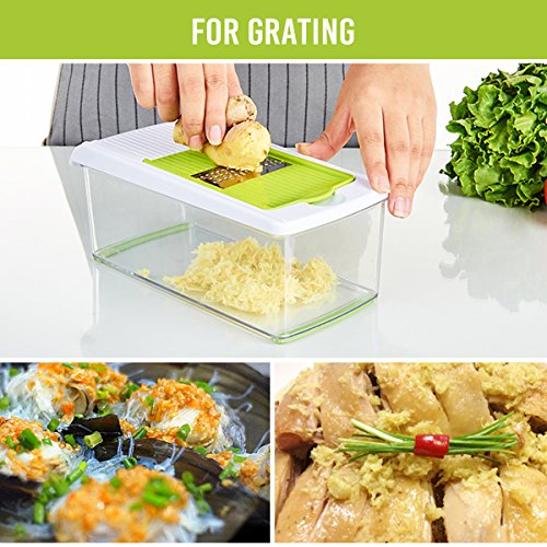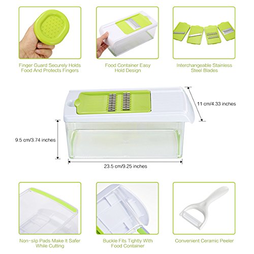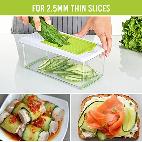 ★DESIGN: The unique design that offers an effective hand guard for protecting your fingers from accidental nicks. Have a big food container for catching sliced, no more having to hold it strategically over a plate and the cover is good for storing up the extra sliced food after cooking. High grade stainless steel and sharp durable blades that won’t rust or bend. Strong enough for a commercial kitchen.