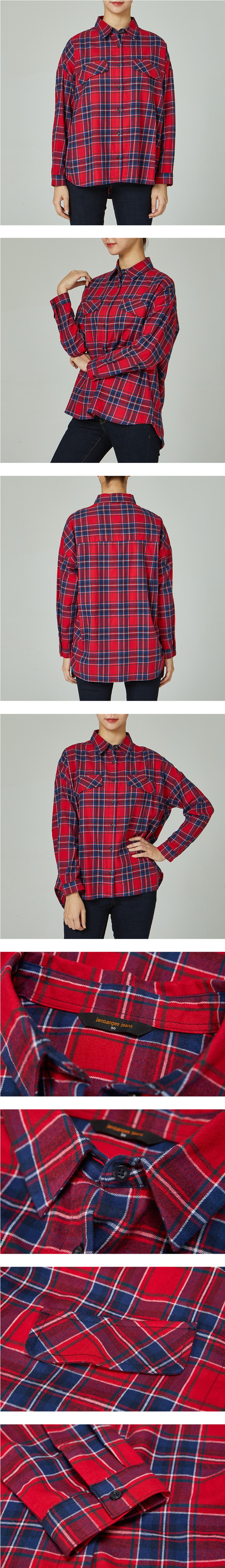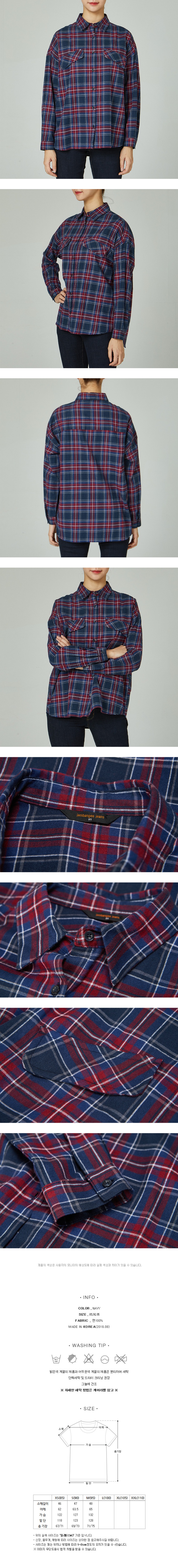 면 플란넬 기모 소재의 루즈핏 여성 전용 셔츠입니다. 가슴포켓 디자인 포인트를 주었으며, 톤 다운된 레드와 네이비 계열의 멀티체크로 은은한 멋스러움이 있는 체크 셔츠 입니다.