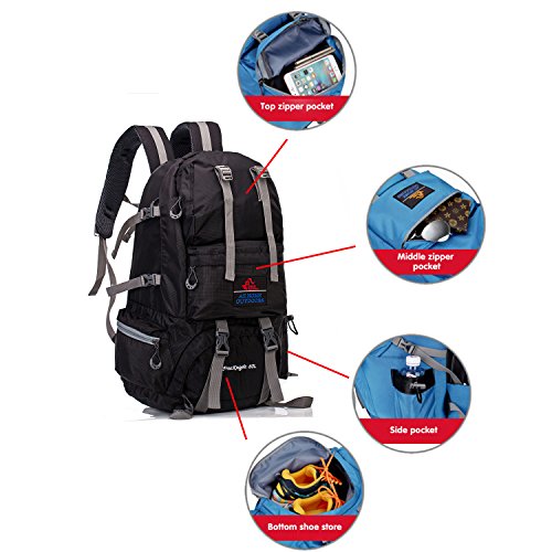 -. Feature : 50L HIKING BACKPACK: 12.6" x 20.87" x 8.7" ( LxHxW ). Weight: 2.13 pounds ( Ultra lightweight ) / HIGH QUALITY: The backpack is made from highly rip and water resistant nylon fabric, provide strengthen and long-lasting performance with minimal weight. / 6 ADJUSTABLE STRAPS: For tying up your pack or hanging sleeping bag, mat, hammock, tripod, and other gears. / MULTIPLE POCKETS: 2 front pocket, 1 hidden pouch, 1 mesh pocket, main compartment with a sleeve for your items separate and organized. / COMFORTABLE TO CARRY: Deep and dense padded shoulder straps and hip-belt, 2 long padded areas on the back offer cushioned comfort, while also promoting air circulation along your back and shoulders