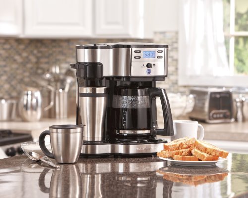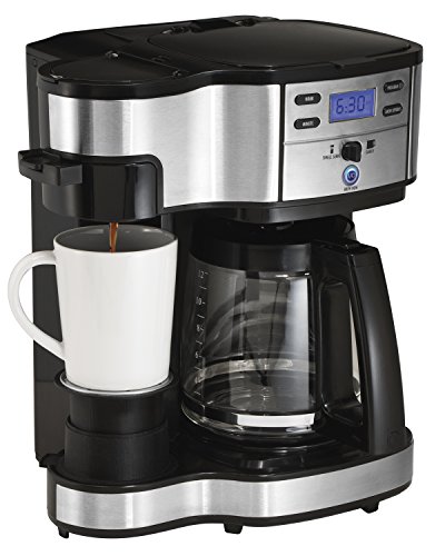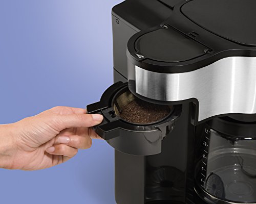 Two ways to brew -- single cup or full 12-cup glass carafe or 14-oz travel mug (not included). Not compatible for K cups Standard-size ''single-serve side'' water reservoir for easy, one-time filling ''Carafe-side'' water reservoir with extra-large capacity and measurement markings ''Single-serve side'' Brew Basket comes with a mesh filter to hold ground coffee or pre-packaged soft pods ''Single-serve side'' multilevel cup rest adjusts/stacks to fit all cup and mug sizes Pod holder snaps onto the single-serve brew basket to hold soft pods Brew strength selector for brewing REGULAR or BOLD preferred flavor/strength Control panel and display, with hour and minute buttons to program the brewing time up to 24 hours beforehand Equipped with programmable timer with 2-hour automatic shutoff