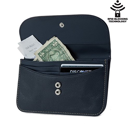 RFID Blocking Technology4 credit card slots 3 large interior pockets for your money, checkbook, receipts or passport1 interior large zip closed pouchExterior zipper pocket for loose change and coins1 interior medium sized pocketSnap closure with 2 different sizes keeping your credit cards closedMeasures 7.5" x 4.5" x 1" inchesSTYLISH AND FUNCTIONAL: The Slim FLAP RFID blocking envelope clutch wallet is the perfect wallet for women. With function and style combined into this compact wallet clutch you are ready to take on the day. Don't wait any longer, protect your identify with the Mundi Slim Flap Envelope Clutch Wallet Organizer today!