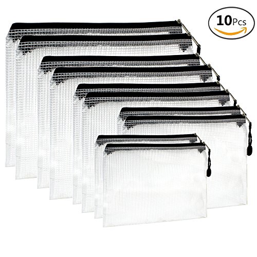 JUSLIN 10pcs Black Zipper File Bags in 5 Sizes, File Holder with Grid Travel Pouch
