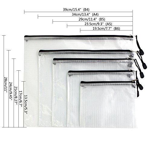 Package contains 10 zipper file bags in 5 sizes: 15.4"x11"(B4), 13.4"x9.45"(A4), 11.4"x8.27"(B5), 9.3"x6.7"(A5), 7.7"x5.3"(B6), 2 pieces per size.
