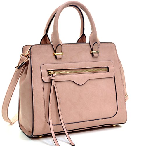 This faux leather satchel features decorative gold-tone hardware, zip-pockets in front and back, detachable shoulder strap and top-zipper closure with three interior pockets. It will help you tote your must-have belongings everywhere you go. The faux leather exterior features vibrant colors that add contrast to your wardrobe.