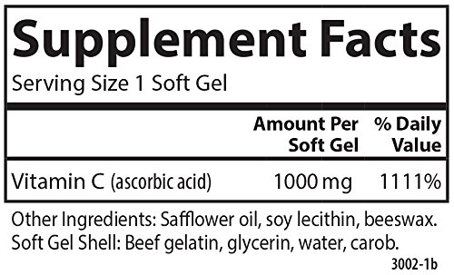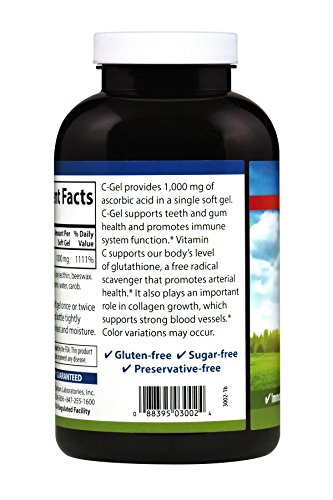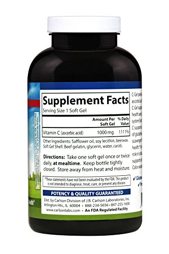 Vitamin C is one of the most popular vitamins taken. As an essential antioxidant it supports healthy immune system function, promotes collagen growth, and supports teeth and gum tissue health. Each Carlson C-Gel soft gel provides 1,000 mg of vitamin C.Feature