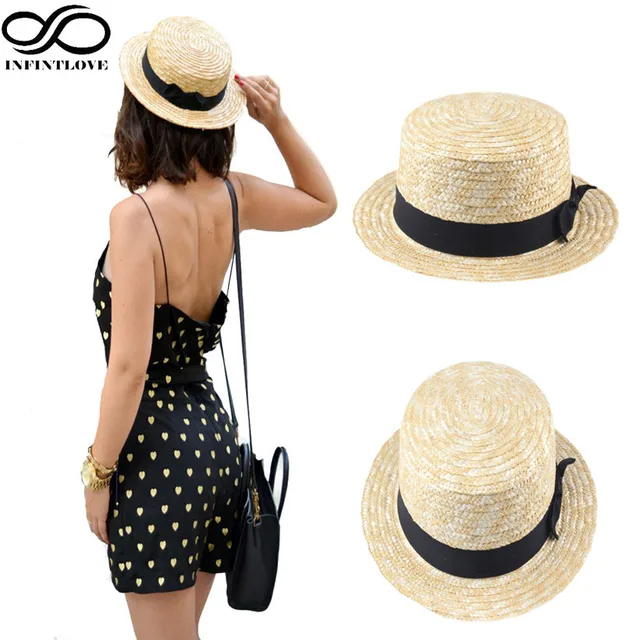 | [해외]INFINITLOVE 베이지 남성 레이디 배타 여름 해변 리본 라운드 플랫 최고 밀짚 페도라 파나마 모자 (한 사이즈: 58 센치메터) |