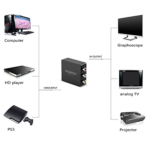 【Plug and Play】No need to install drivers, portable and flexible, easy and convenient to use.Compatible with devices such as PS3 / Xbox / DVD with HDMI port, TV / Monitor / Projector with RCA port.Perfect for AV equipment testing, CCTV monitoring, HD PC to TV, DV to Projector and Education, business promotion, conference, exhibition etc.