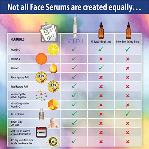 -. Feature : NEW PACKAGING - SAME AWESOME FORMULA - VIDI serum users are addicted to our product. We have updated to a fresh new look. Have you got yours yet? / GET CLEARER, SMOOTHER GLOWING SKIN - Incredible peptides, Alpha hydroxy Acid, Beta Hydroxy ACid packed in with Vitamins C, A & E. There is no other Face Serum like it / VIDI ANTIOXIDANT FACE SERUM WORKS! Look in your mirror and think "WOW!", Go work with no makeup on, Get complements with your baby soft skin. This is what VIDI customers are telling us after they try VIDI Antioxidant Face Serum. / INSTANTLY SOFTER SKIN as you luxuriate in on of the the most powerful serum c 's on the market / TRUE ANTI AGE RESULTS with lighter and brighter skin; faded age & dark spots. VIDI Vitamin C Serum for face has glycolic & salicylic acids to exfoliate surface skin cells giving deepest penetration to speed removal of freckles, dark & age spots resulting in beautiful clear skin tone