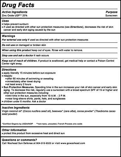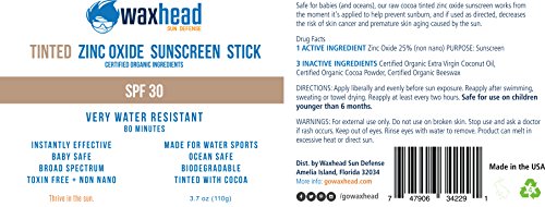 Our non-nano Zinc Oxide Sunscreen stick is specifically optimized for people who participate in active aquatic sports such as surfing and snorkeling, and complies with the 80 Minute Immersion Very Water Resistant standard. Waxhead Sunscreen is free of common allergens and is hypoallergenic. Made in the USA. Light brown tint is from Organic Cocoa Powder, which can stain clothing. Ideal for facial areas.Feature